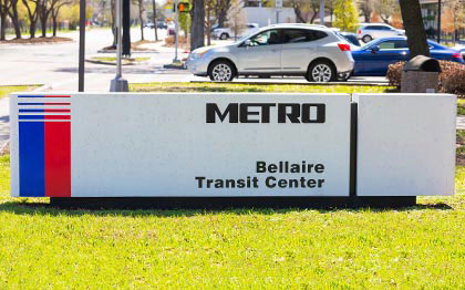 All METRO buses have large, bright destination signs on the front of the bus above the windshield and along the passenger’s side, near the front door. These digital displays include the route number and destination.